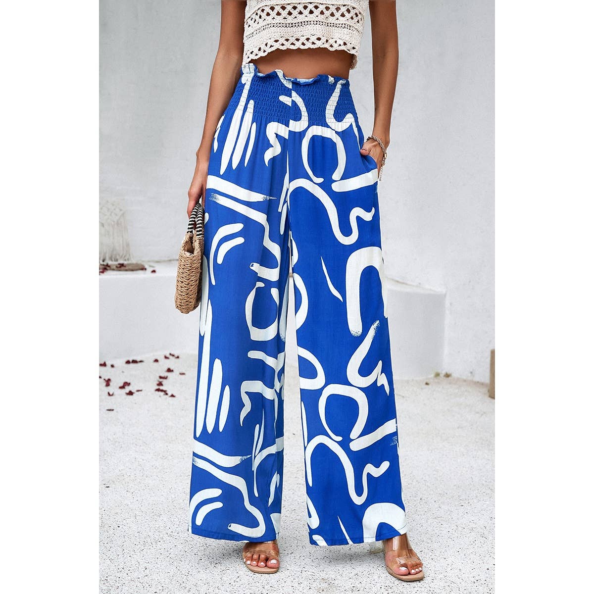 Allover Print Folded Frill Edges Wide Leg High Waist Pant