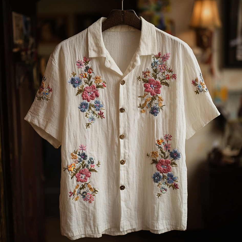 Bohemian Style Plant And Flower Pattern Retro Cotton And Linen Men's Short-sleeved Shirt