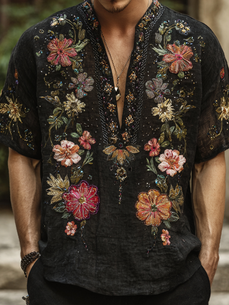 Bohemian Style Three-dimensional Multi-colored Floral Silver Rhinestone Men's V-neck Short-sleeved Shirt