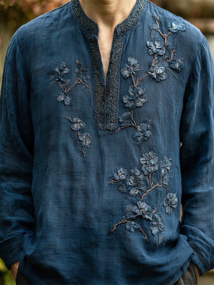 Boho Floral Embroidery Men's Linen Long Sleeve Shirt