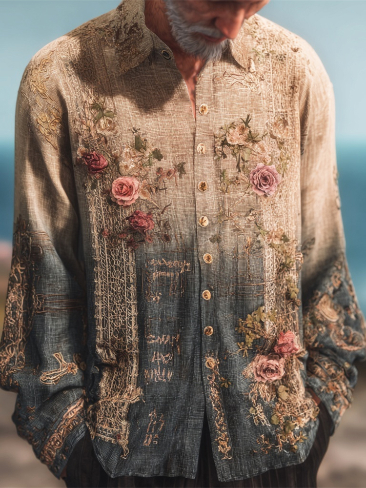 Boho Vintage Floral Art Men's Linen Long Sleeve Shirt