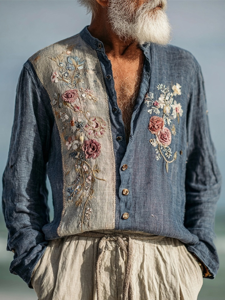 Boho Vintage Floral Patchwork Men's Linen Long Sleeve Shirt