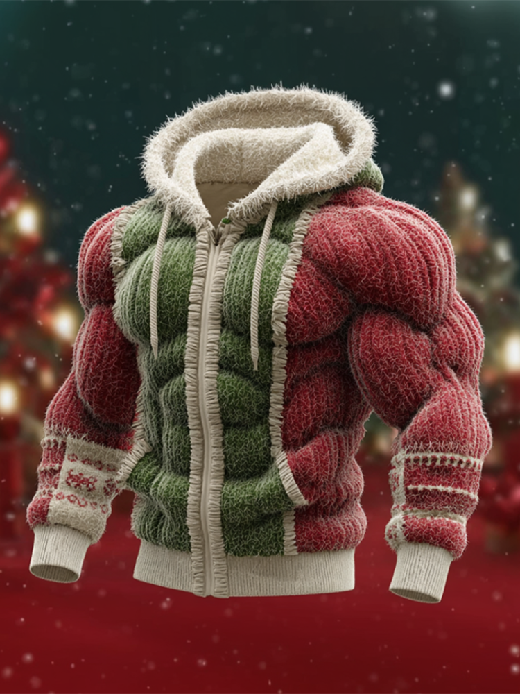 Christmas Men's Simulated Muscle Lines Design Hooded Knit Sweater Jacket