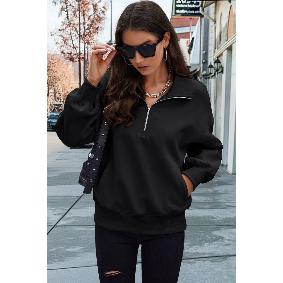 Drop Shoulder Zipper Loose Fit Pockets Hoodie