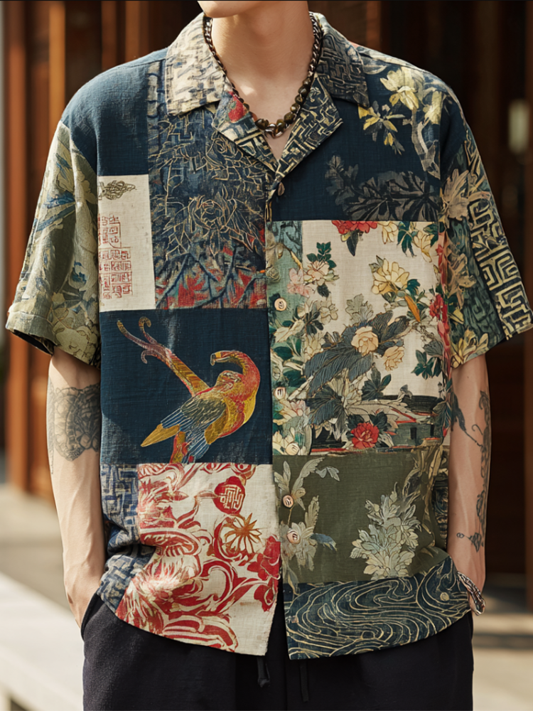 Japanese Art Style Plant And Flower Pattern Men's Cotton And Linen Short Sleeve Shirt