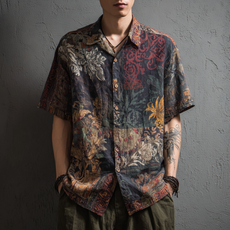 Men's Bohemian Plant Flower Pattern Retro Cotton And Linen Shirt