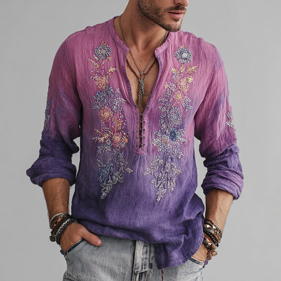 Men's Bohemian Style Purple Gradient Flower And Grass Embroidery Pattern Retro Cotton And Linen Short-sleeve Shirt