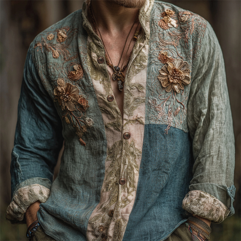 Men's Boho Floral Fiber Art Embroidered Colorblock Linen Shirt