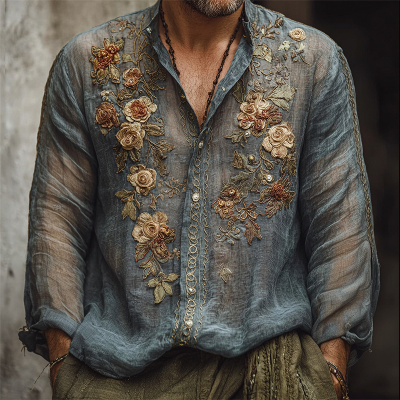 Men's Boho Floral Fiber Art Embroidered Flowy Linen Shirt