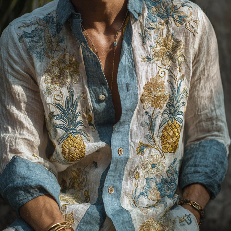 Men's Boho Pineapples Floral Embroidered Beach Linen Shirt
