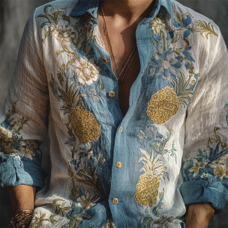 Men's Boho Pineapples Floral Embroidered Contrast Beach Linen Shirt