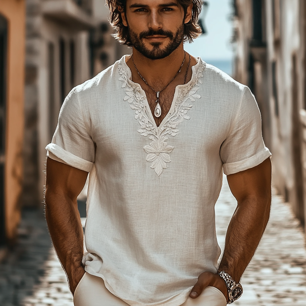 Men's Casual Floral Embroidered Cotton And Linen V-neck Shirt