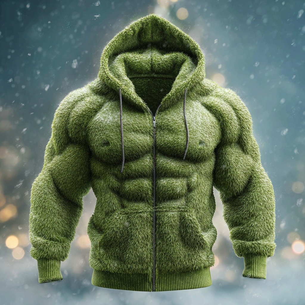 Men's Christmas Season Green Muscle Art Comfy Plush Hooded Coat