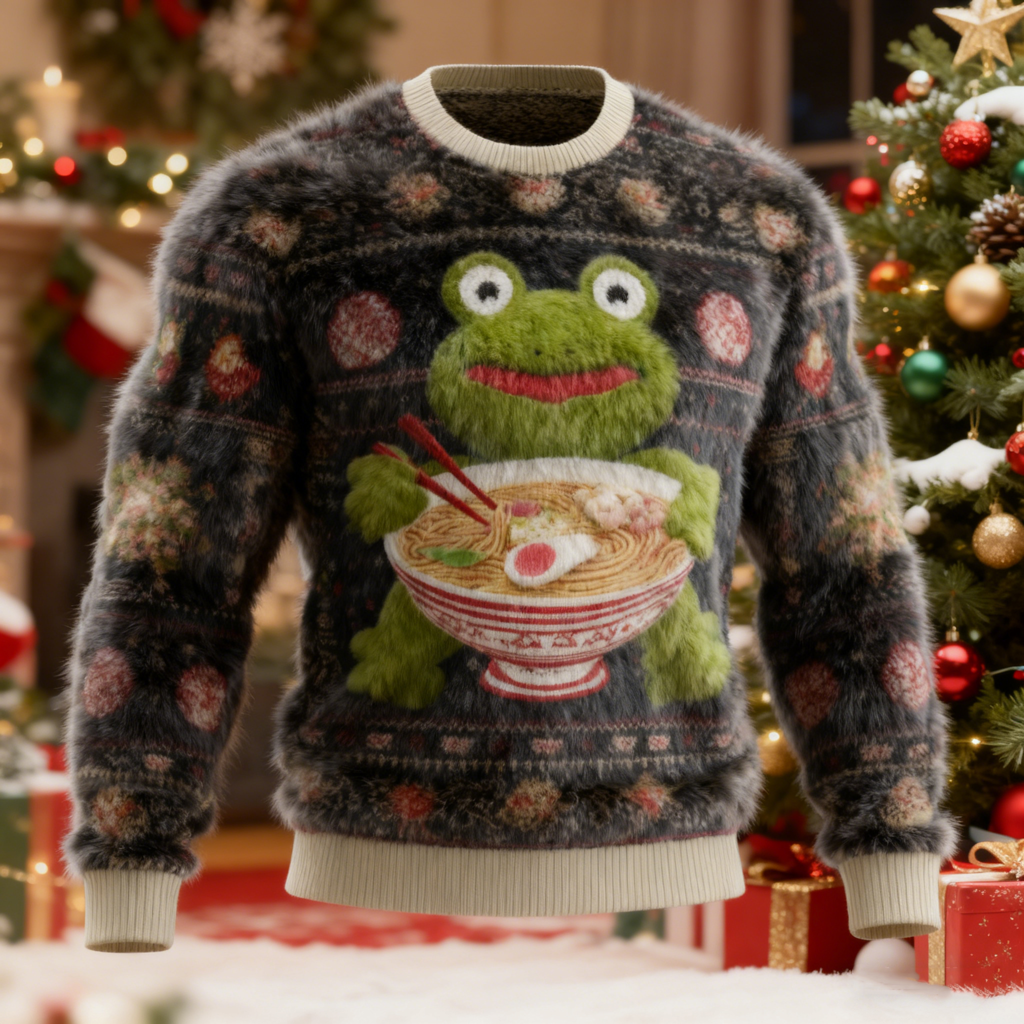 Men's Frog With Santa Hat Pattern Ugly Plush Crew Neck Sweatshirt