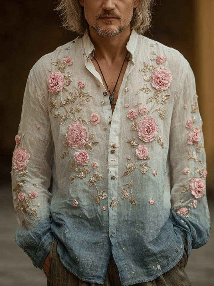 Men's Pink Rose Embroidery Tie-dye Vintage Long-sleeved Shirt