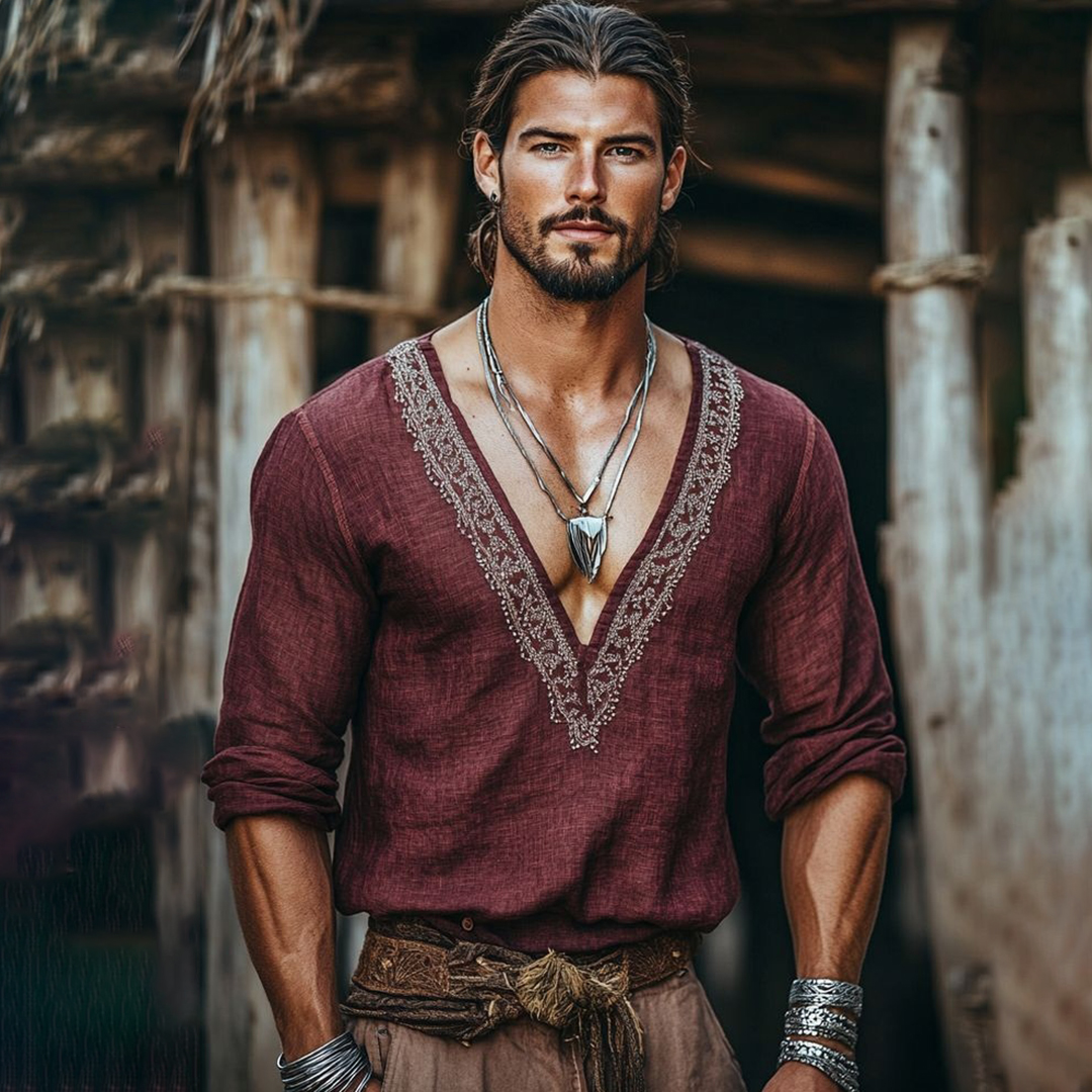 Men's Retro Celtic Totem V-neck Cotton Linen T-shirt