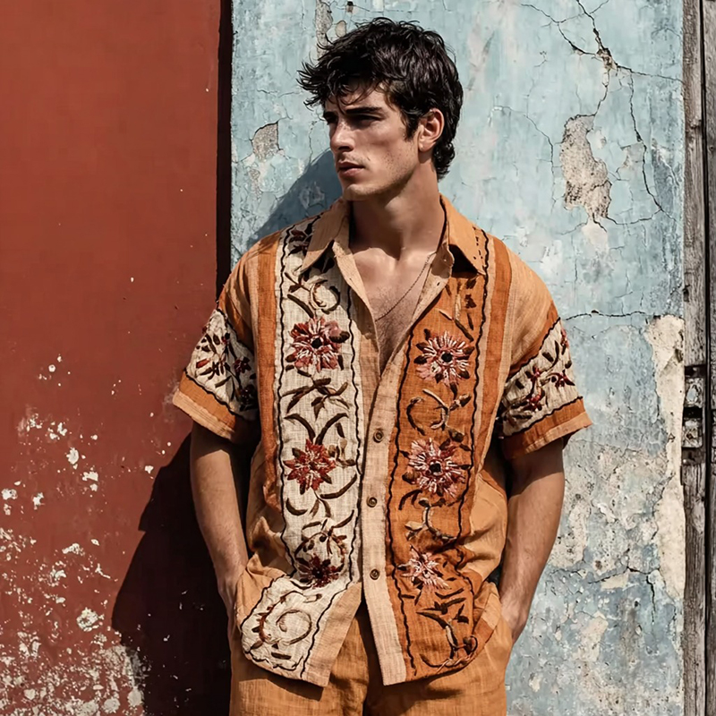 Men's Retro Floral Colorblock Linen Short Sleeve Shirt
