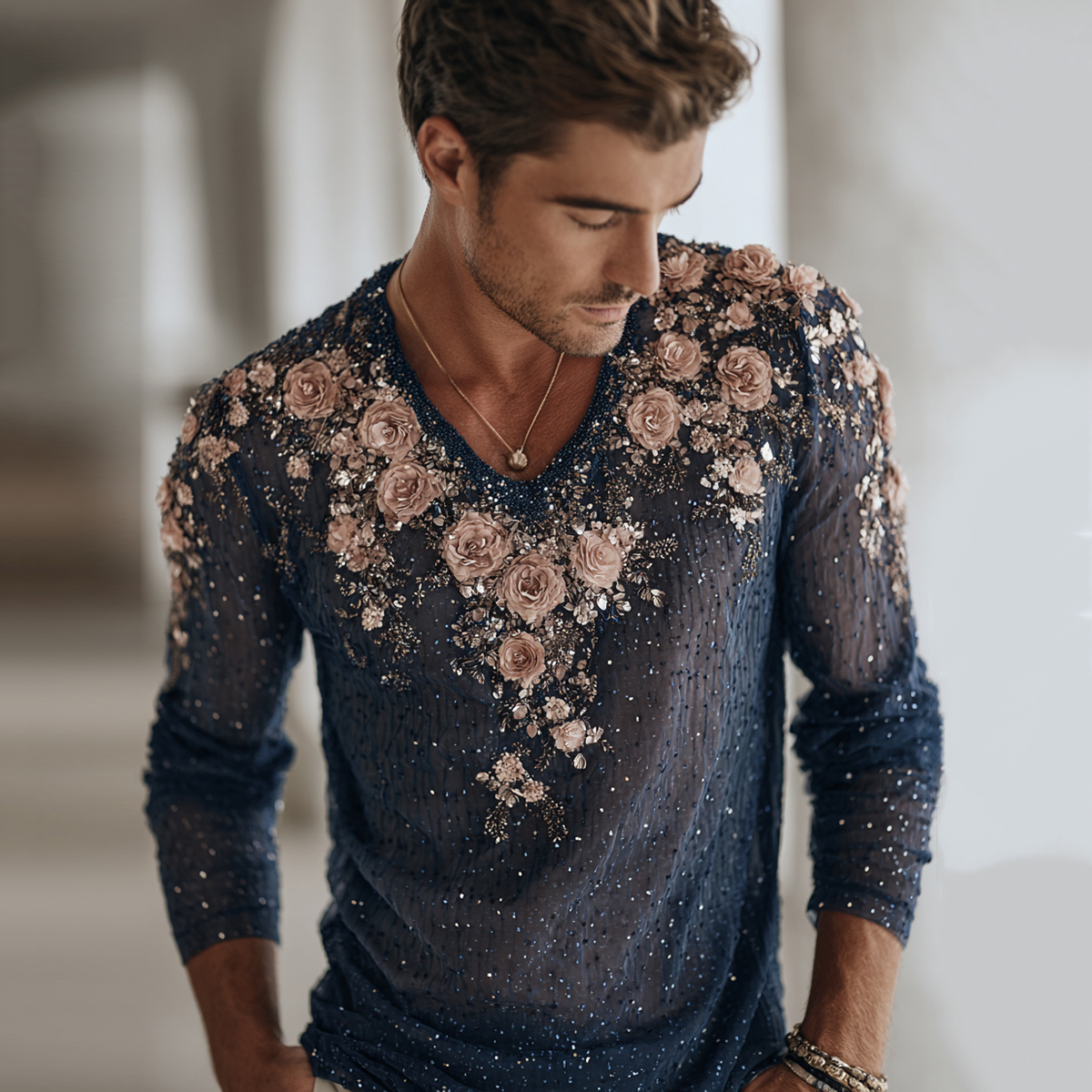 Men's Retro Floral Embroidered Comfy Linen V Neck Shirt