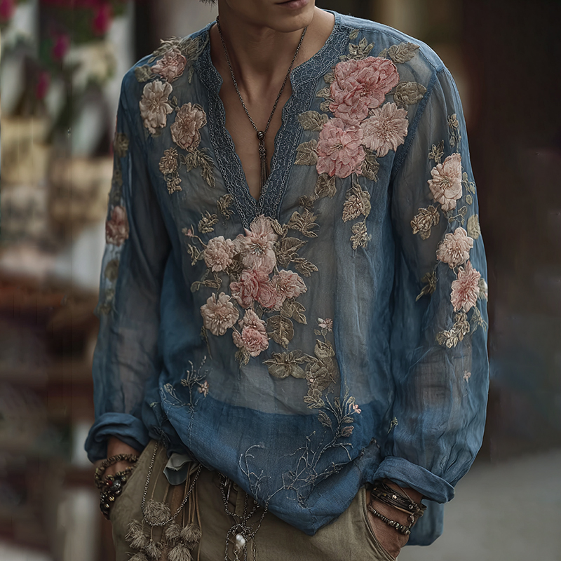 Men's Retro Floral Embroidered Comfy Linen V Neck Shirt