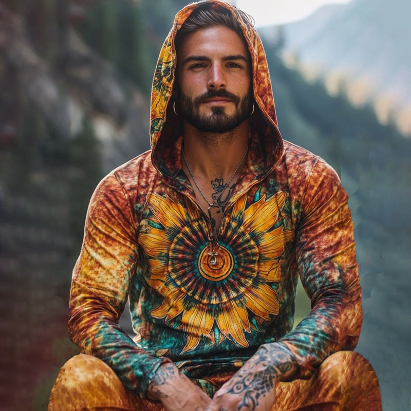 Men's Retro Hippie Sunflower Tie Dye Pattern Hoodie