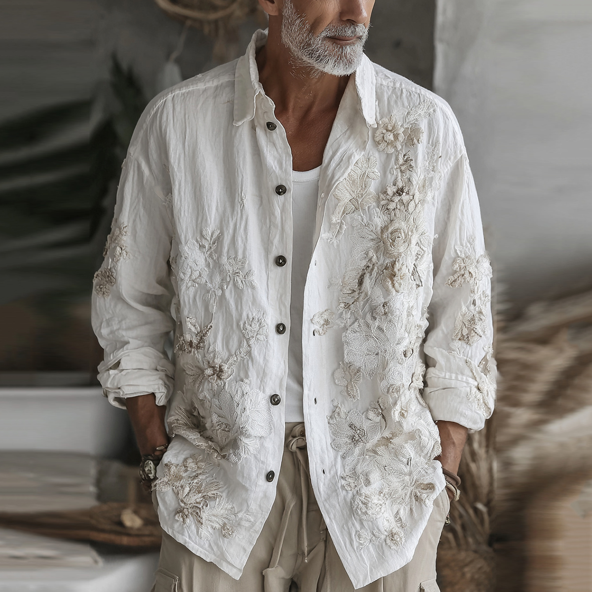 Men's Retro White Floral Embroidered Comfy Linen Shirt