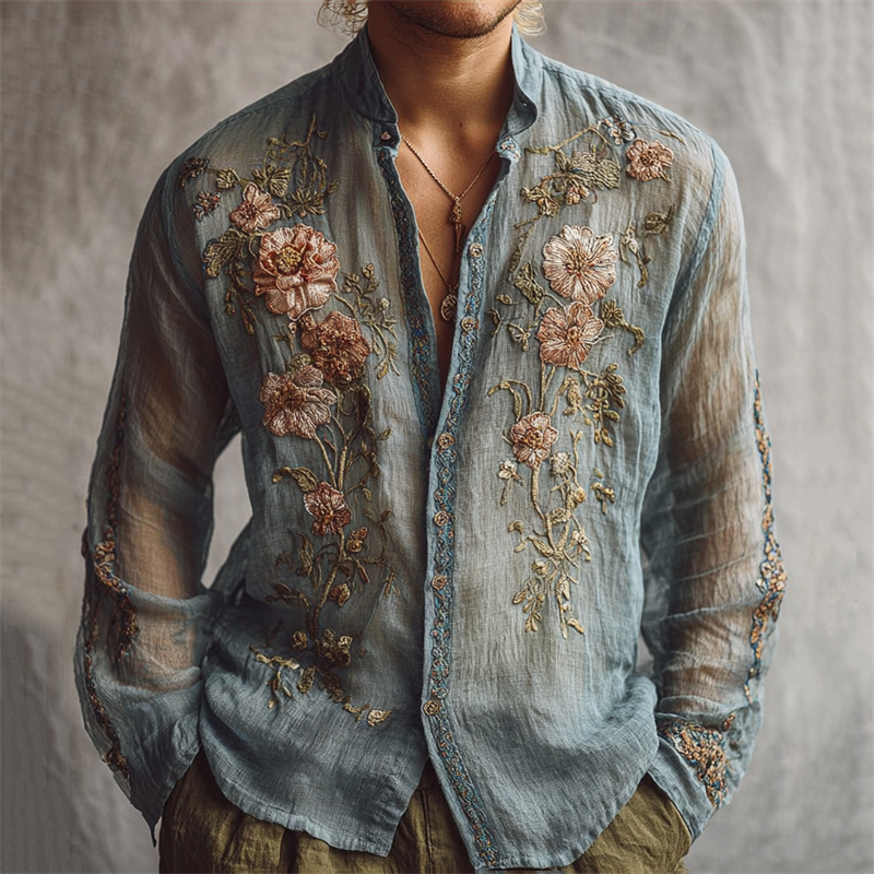 Men's Vintage Boho Floral Embroidered Flowy Linen Shirt
