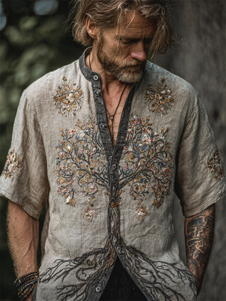 Men's Vintage Boho Floral Tree Of Life Embroidered Linen Shirt