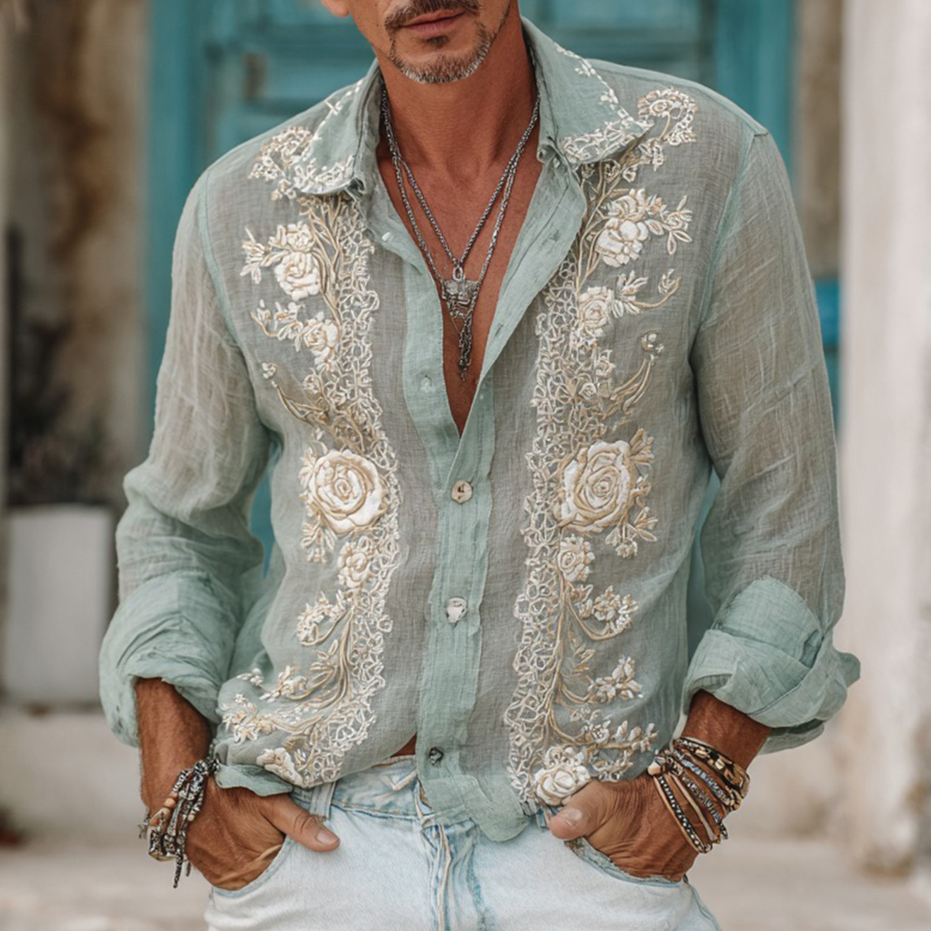 Men's Vintage Floral Embossed Comfort Linen Shirt