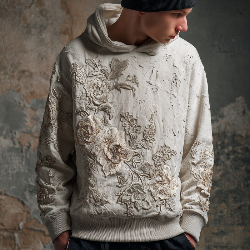 Men's Vintage Floral Embroidered Comfy Hoodie