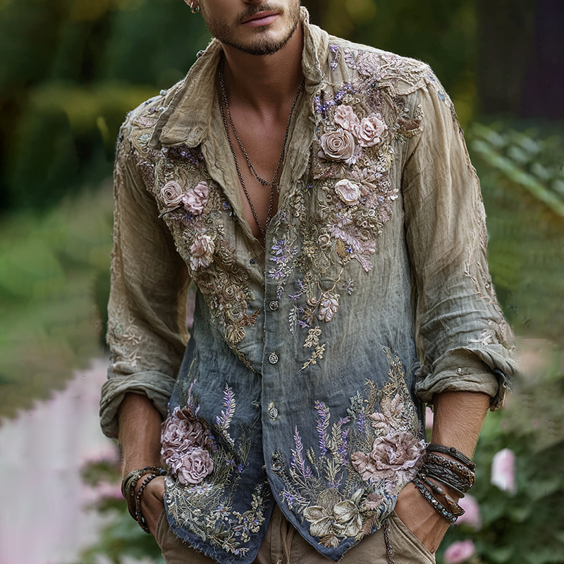 Men's Vintage Floral Embroidered Comfy Linen Shirt