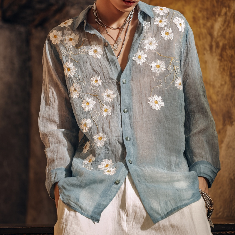 Men's Vintage Floral Embroidered Comfy Linen Shirt