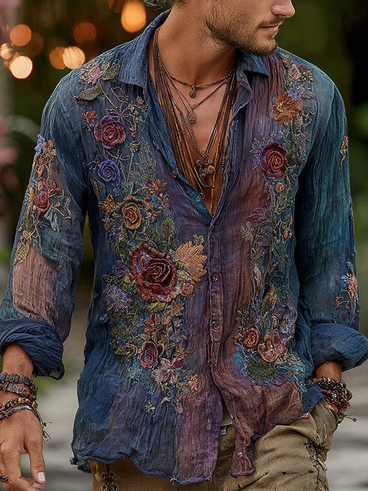Men's Vintage Floral Embroidered Comfy Linen Shirt