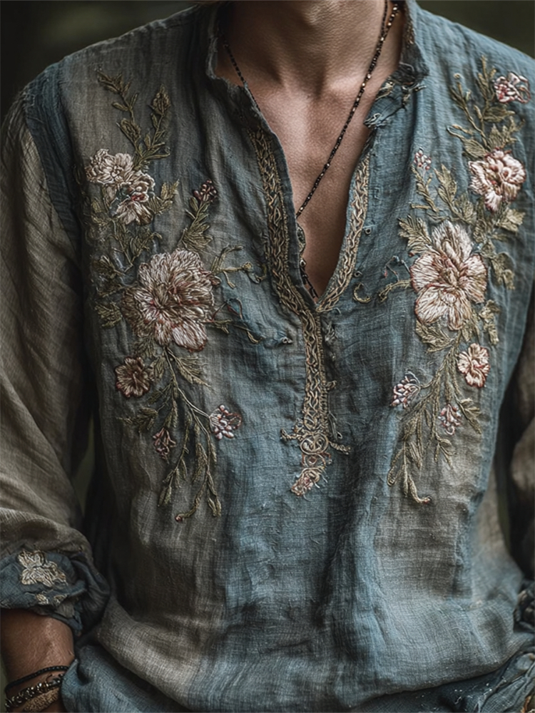 Men's Vintage Floral Embroidered Contrast Linen Shirt