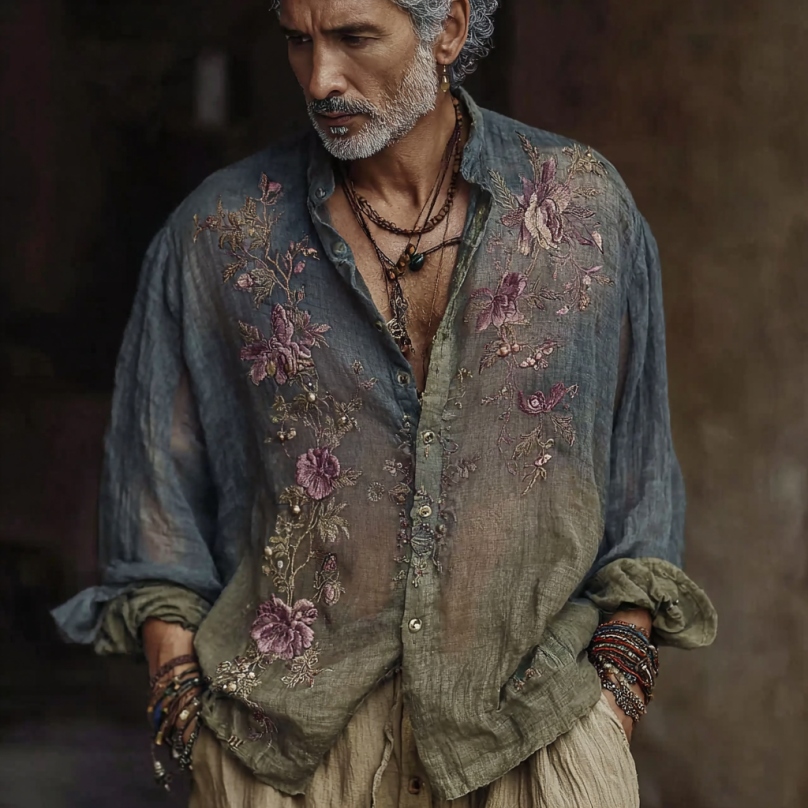 Men's Vintage Floral Embroidery Art Gradient Long Sleeve Shirt