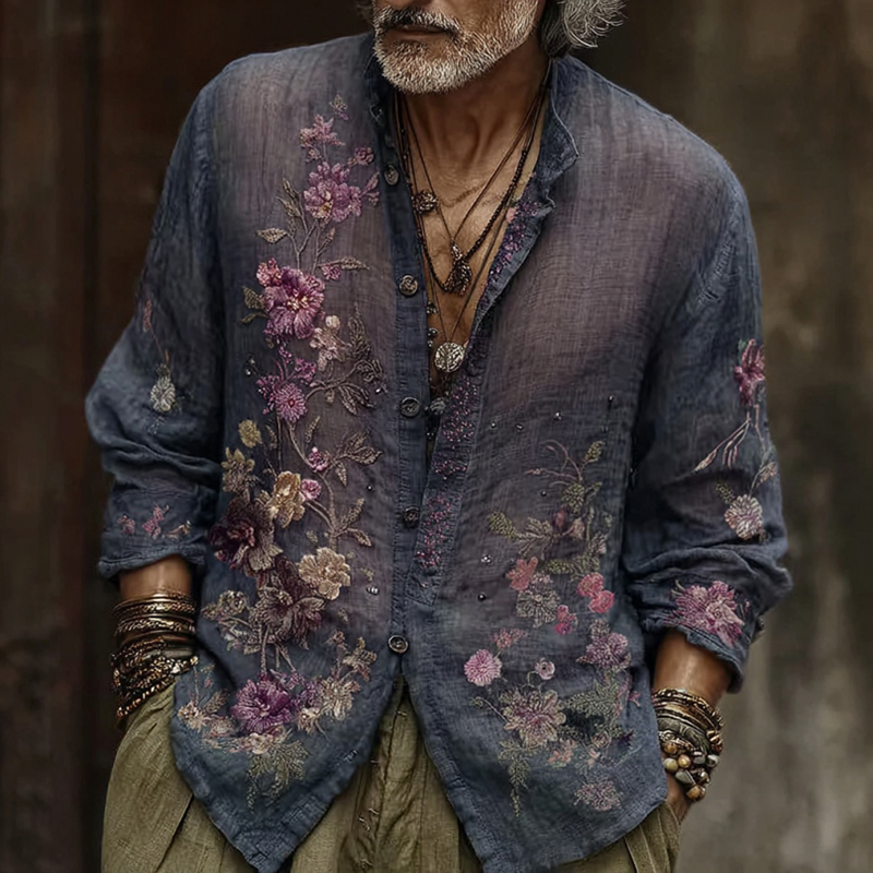 Men's Vintage Floral Embroidery Art Long Sleeve Linen Blend Shirt