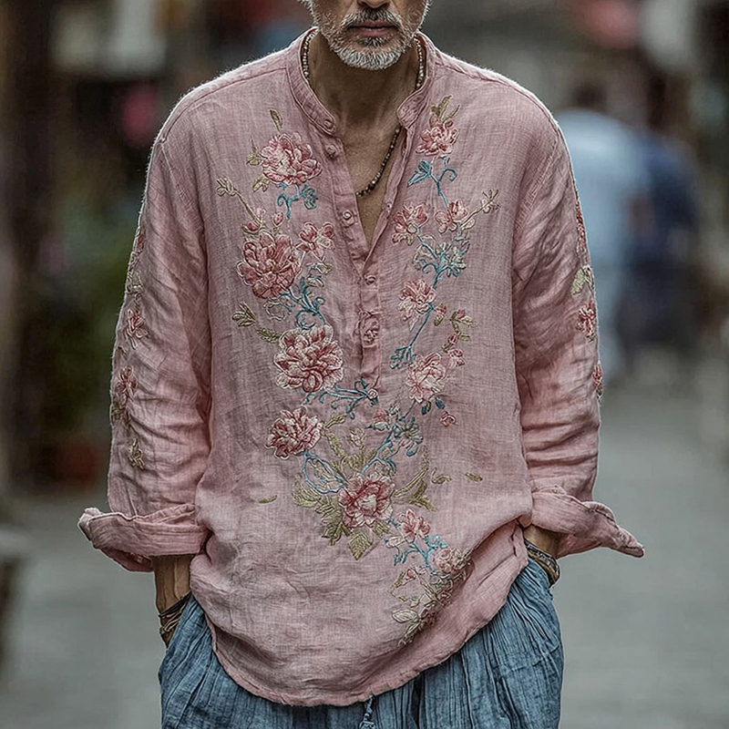 Men's Vintage Floral Embroidery Button-down Linen Shirt