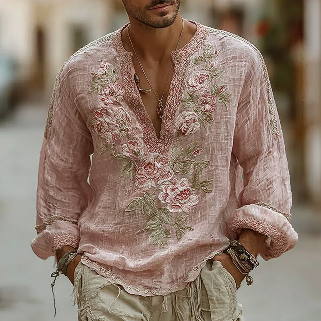 Men's Vintage Floral Embroidery Linen Shirt