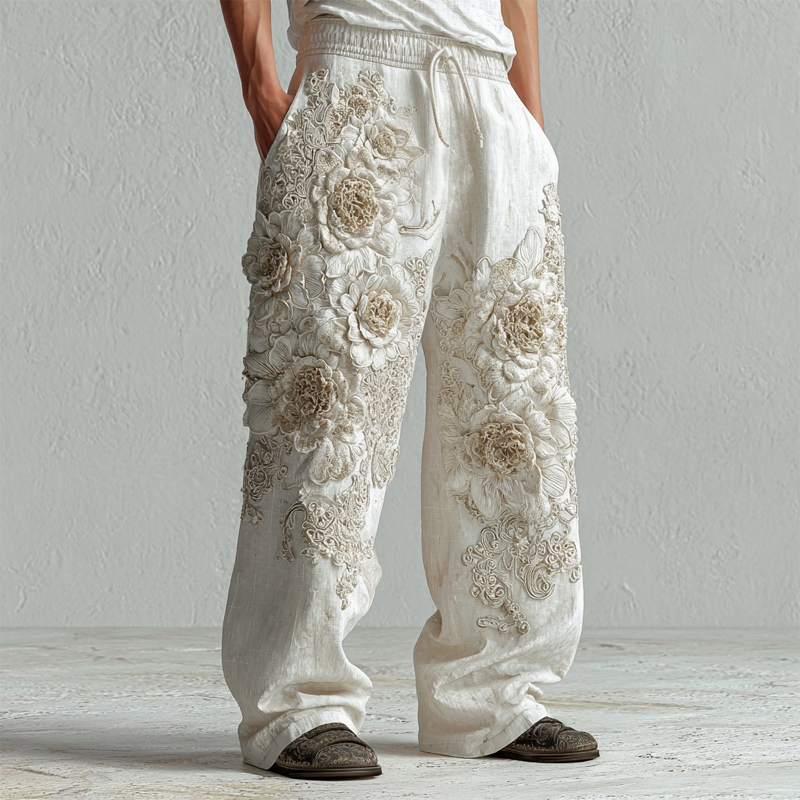 Men's Vintage Floral Lace Embroidered Casual Linen Pants