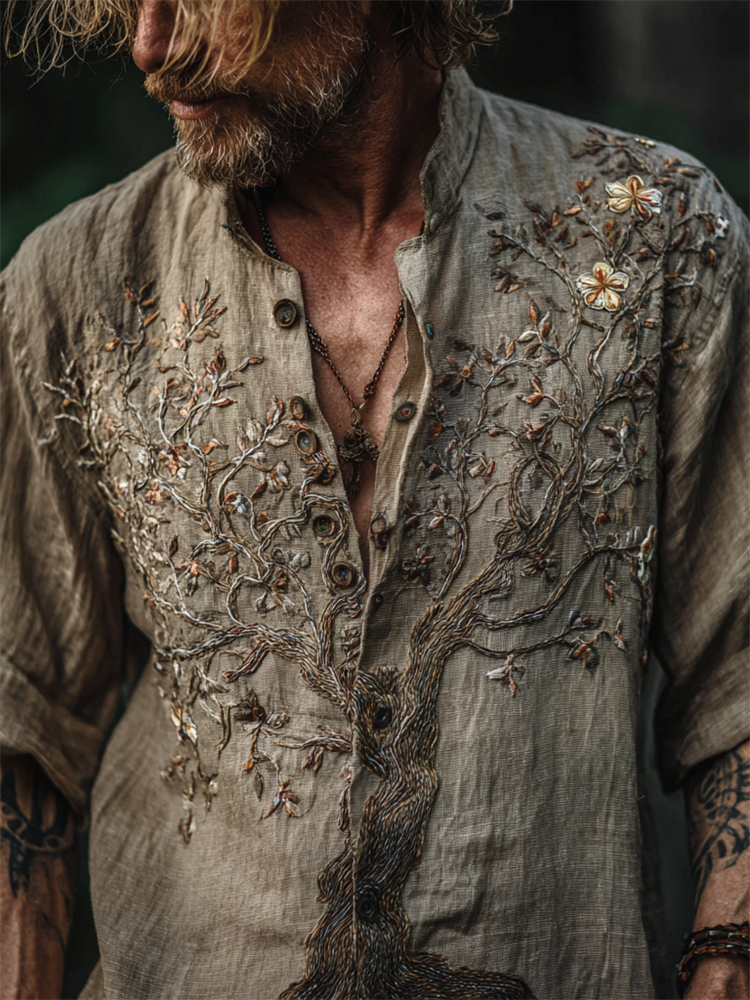 Men's Vintage Floral Tree Of Life Embroidered Linen Shirt