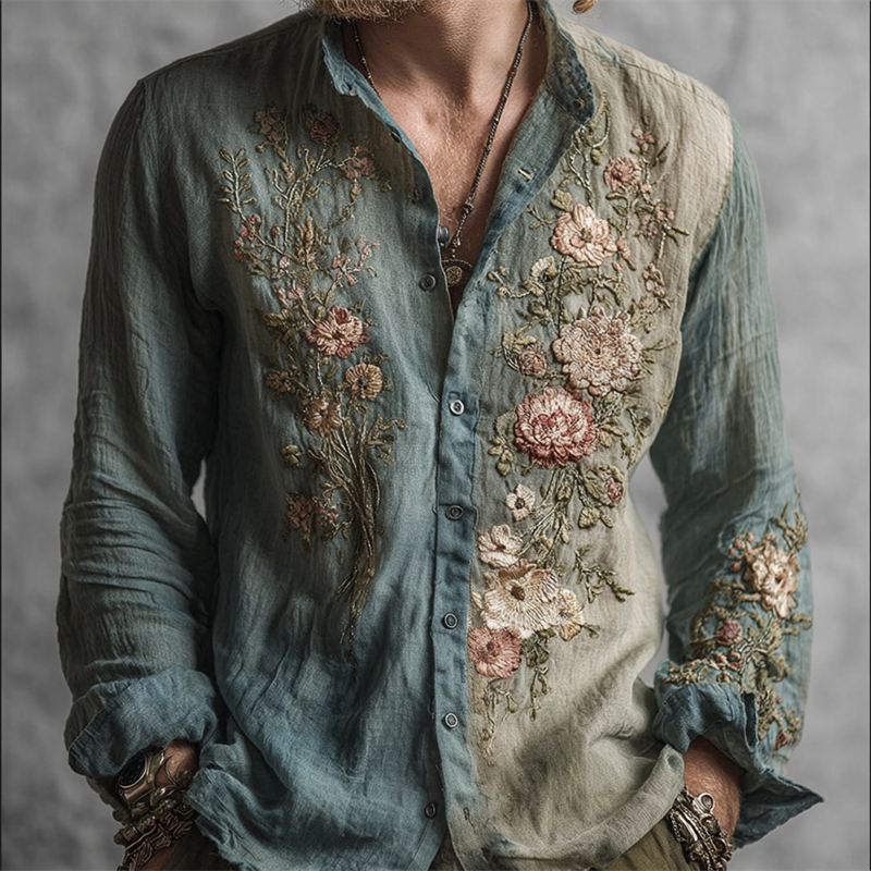Men's Vintage Flowers Embroidered Contrast Linen Shirt