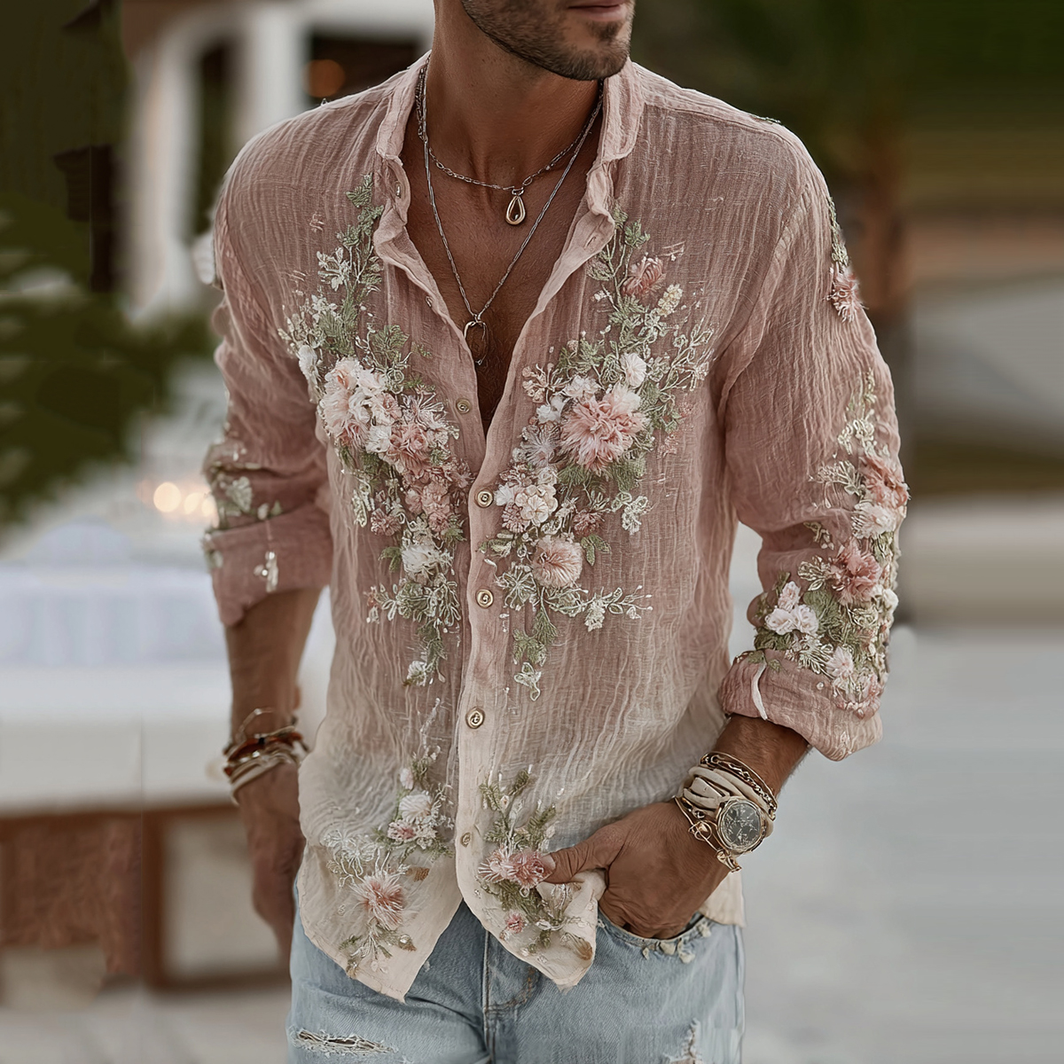 Men's Vintage Gradient Floral Embroidered Comfy Linen Shirt