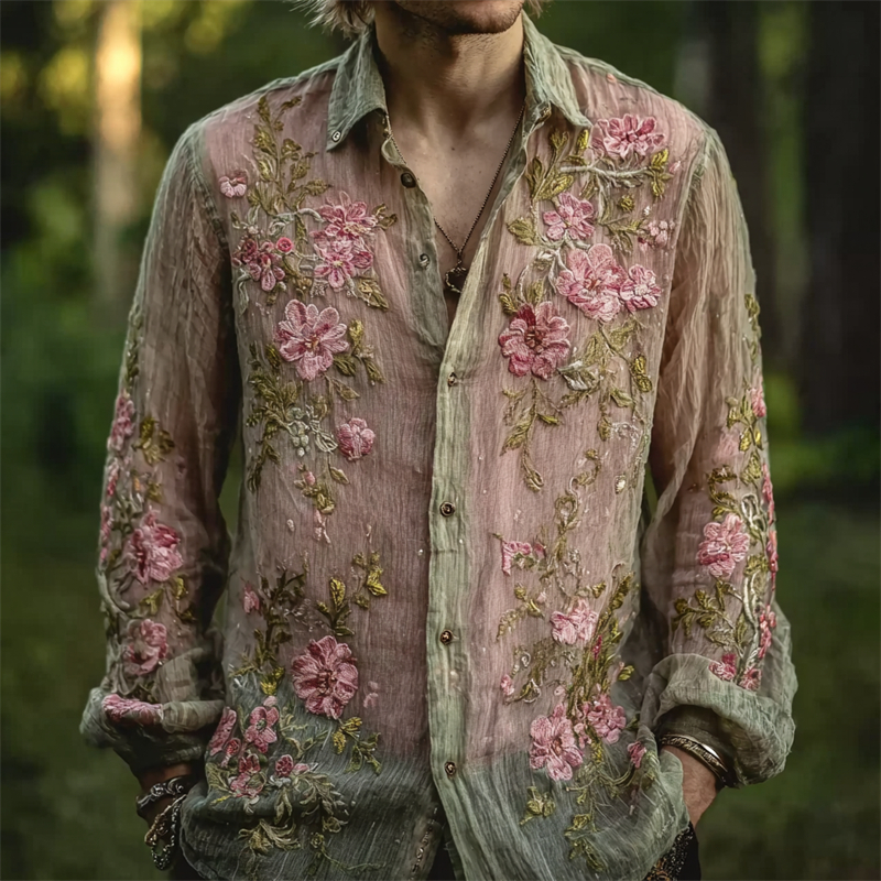 Men's Vintage Pink Floral Embroidered Forest Dyed Linen Shirt