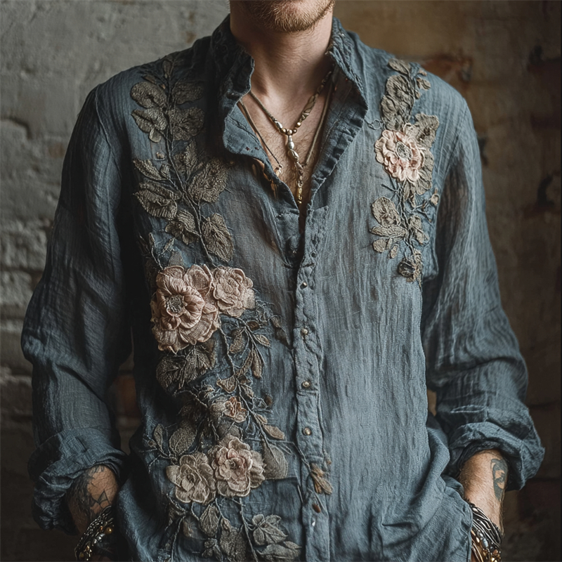 Men's Vintage Roses Floral Embroidered Linen Shirt