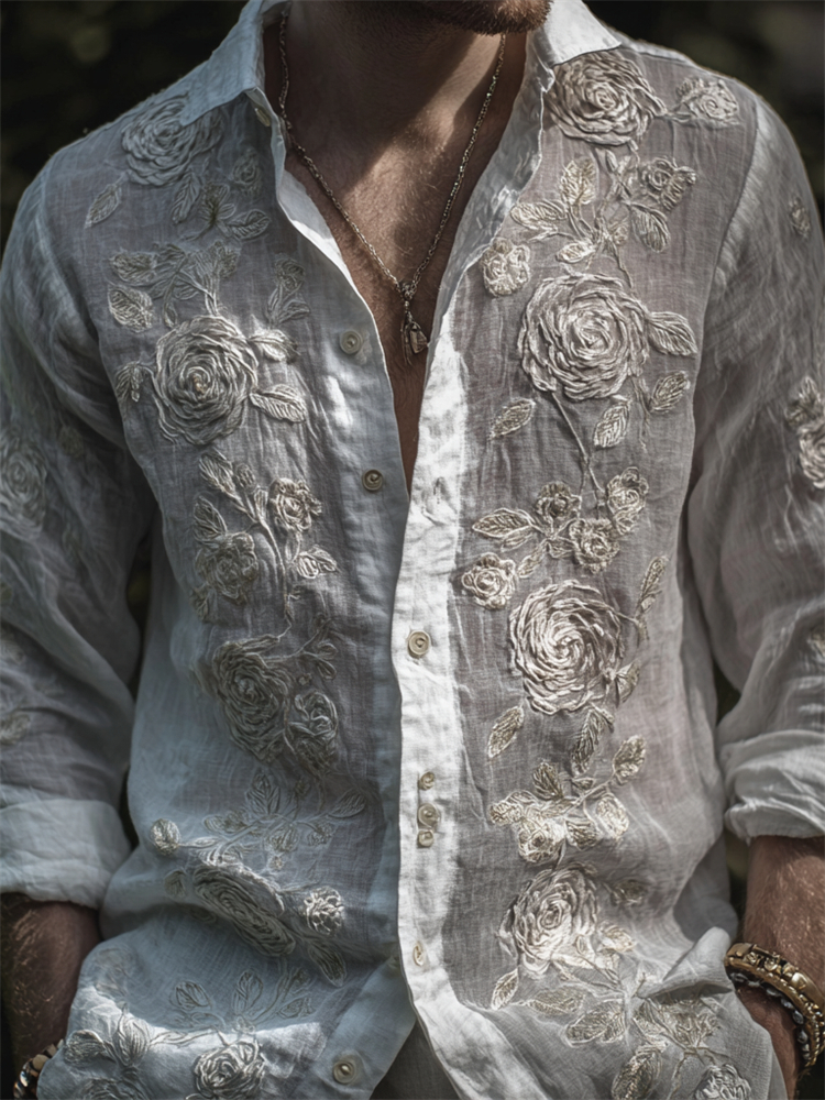 Men's Vintage White Roses Embroidered Flowy Linen Shirt