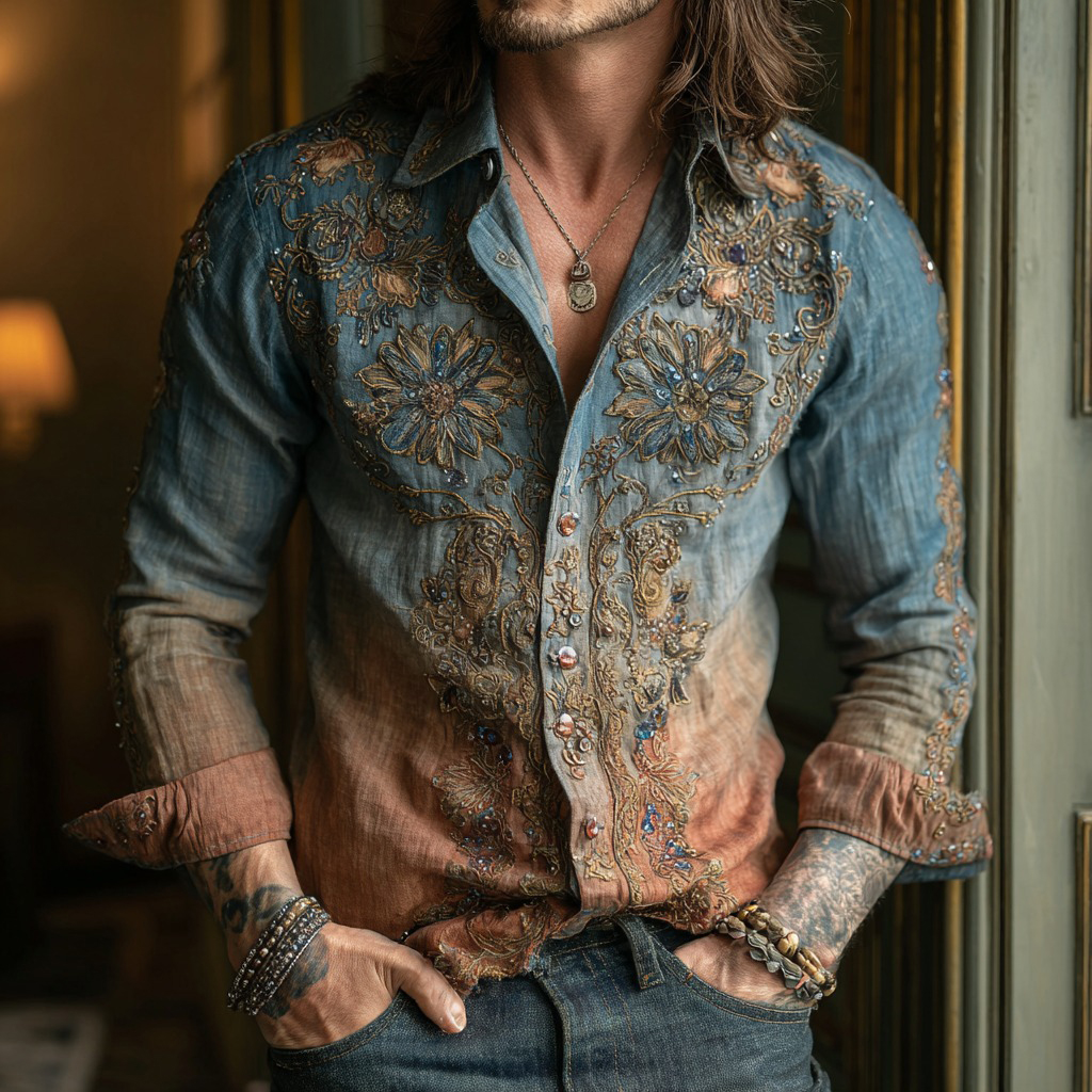 Retro Floral Embroidery Art Linen Gradient Shirt