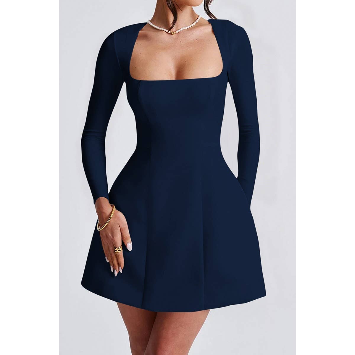 Square Neck Long Sleeve Pleated Short Dress