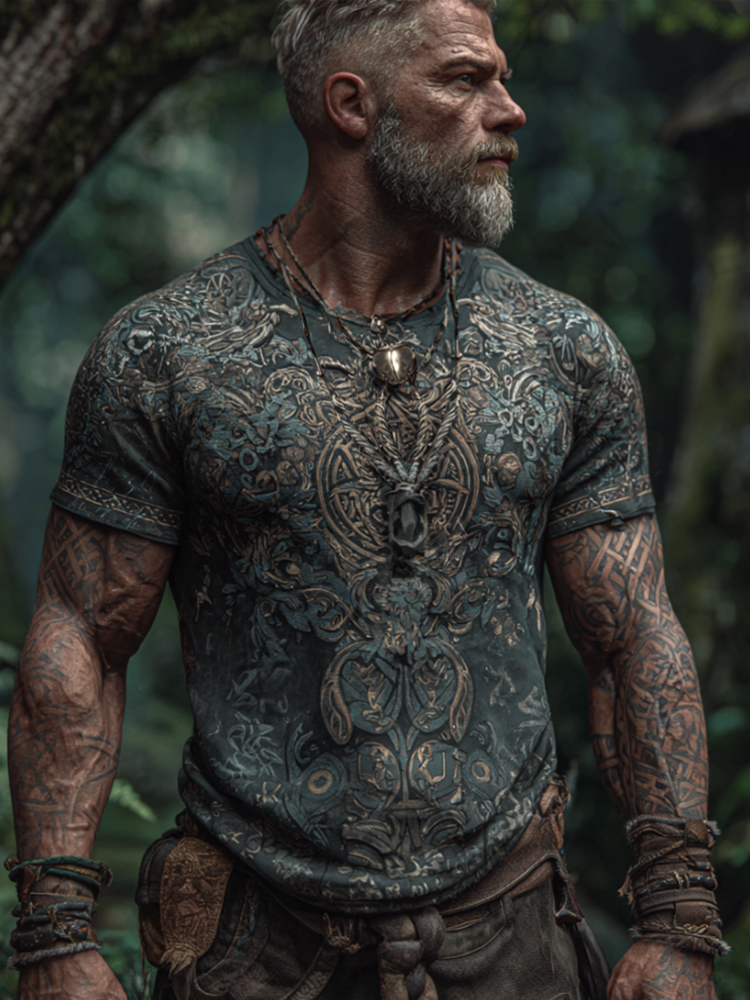 Viking-style Vine Embroidery Round-neck Short-sleeved Shirt