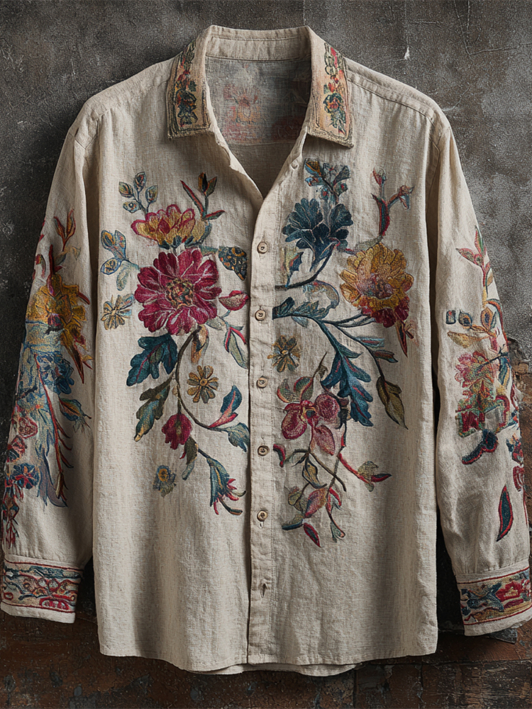 Vintage Bohemian Floral Art Men's Linen Long Sleeve Shirt