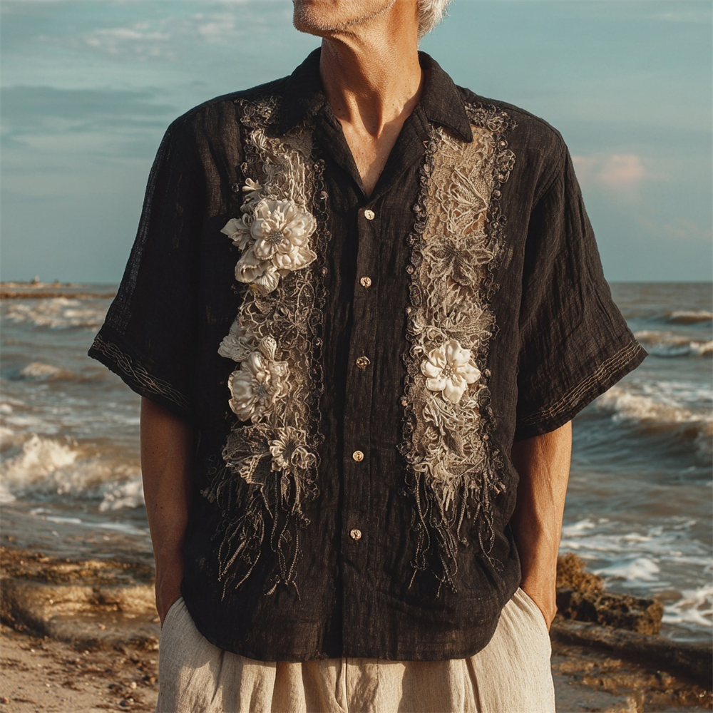 Vintage Boho Lace Floral Art Men's Linen Short Sleeve Shirt