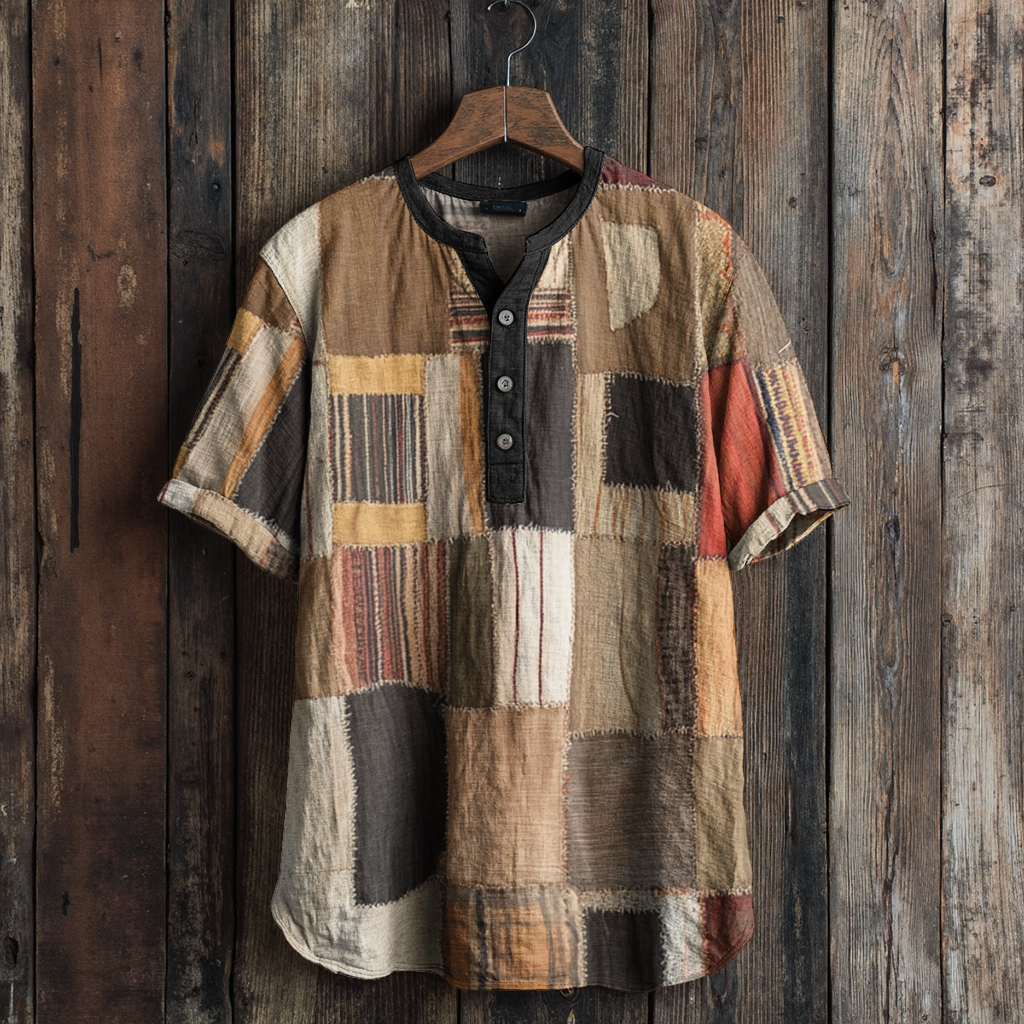 Vintage Boho Patchwork Print Men's Linen V-neck Shirt